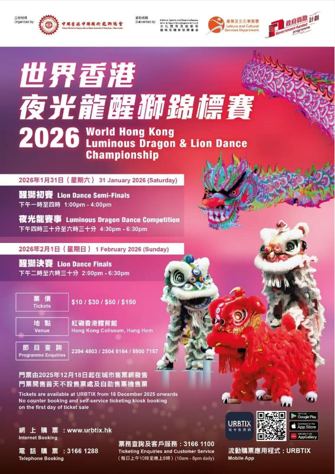 泰亚传媒讯|由中國香港中國國術龍獅總會主辦,並獲得民政事務局(藝術及體育發展基金)及康樂及文化事務署資助的第十六屆世界龍獅爭霸戰——「世界香港夜光龍・醒獅錦標賽2026」,將於2026年1月在紅磡香港體育館隆重舉行。