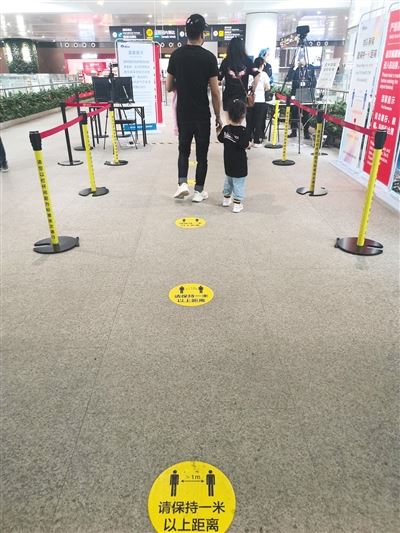 休息区内,有不少旅客正在休息,疫情防控期间,旅客们都自觉地隔座落座。进入航站楼前,旅客需要先经过测温通道,为了防止人员聚集,大兴机场在测温通道地面贴有“一米线”。