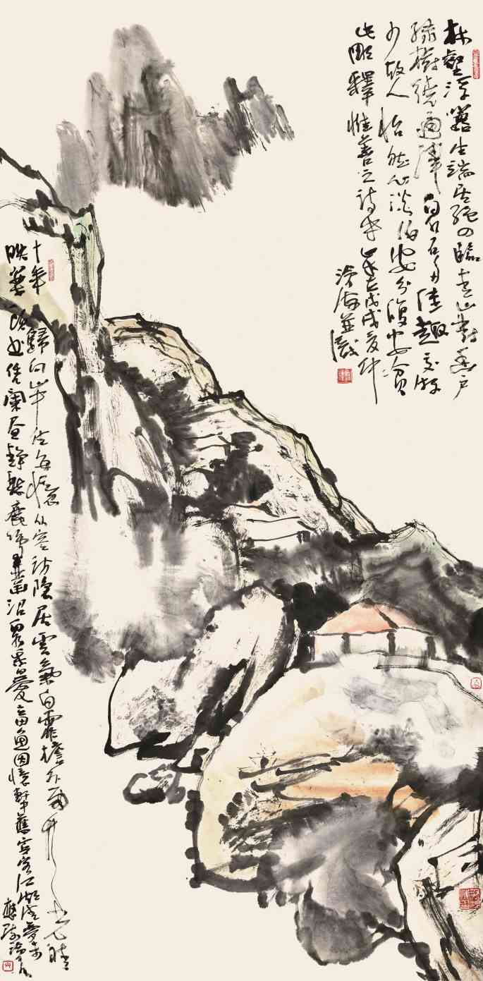 欣赏沧海的国画,不得不重视他对国画用笔的讲求、选择和突破。无数前辈国画大师都指出,国画的关键在于用笔。并深深追求着用笔的奥妙和笔法的精道。可以说,没有笔墨就不存在国画。在国画数千年的发展历史中,形成了完善的笔法体系。所谓画“画”中的“画”,确实是“依笔而立”的。众所周知,国画用笔已先后形成了以人物画勾填为主的描法体系,以山水画涂布为主的皴擦体系,以花鸟画点染为主的写法体系。从最初的书画同源开始到最后以写法入画,每一笔都是形色一体的组合,更加体现了用笔对国画发展的关键与主导作用。从元代开始,所有有成就的国画大师,无不在笔墨的创造上有独到的成就与贡献。