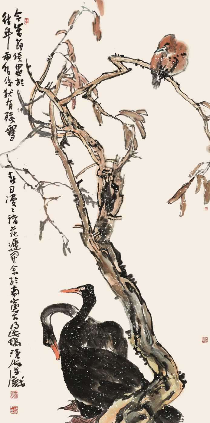 反之,从他画作的用笔上,我们也可看到书法对他绘画的促成与影响。他的用笔有力而得体。不少人很难理解所谓力透纸背、力能扛鼎这类形容。由于中国书画纸笔墨的特殊性能,要使笔锋送墨至纸背是要功力的,这个力是一种强大的随机应变的掌控能力。我曾举过一个例子来说明这点。笔力犹如中国人用筷子夹起盘子中大小不同块的嫩豆腐,既不能碎,也不能掉落的一种力道。是一种可意会也可言传的多年练习的掌控功夫。而这种功夫的得体使用,那就是每个个体的不同招数了。沧海的用笔在起落与提按上很有特色,使他的作品顺滑而有节奏,干脆中不失柔绵。大幅不空,小幅不塞,涂染处彰显笔路,写画处紧劲浑然。