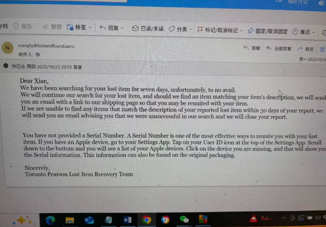 十月二十日17点整,我收到他们的第五封邮件,上面写着:“我们已经寻找七天了,但尚未找到您的物品……如果三十天内仍无结果,我们将关闭你的报告。”