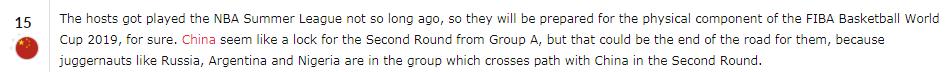 在点评中国队时,国际篮联写道:“东道主中国队不久前参加了NBA夏季联赛,所以他们肯定会为接下来的世界杯做好充足准备。他们几乎锁定了A组晋级第二轮小组赛的一个名额,但这很可能就是中国队前进的终点了,因为第二轮小组赛中国队很可能遇到俄罗斯、阿根廷和尼日利亚等强队。”